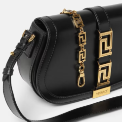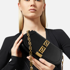Harnessing Versace’s reverence for myth and culture, the Greca Goddess line is characterised by the central Greca chain hardware and detachable chain strap. Crafted in Italy from smooth leather, it features a spacious interior with an additional slip compartment. An interchangeable leather strap can be adjusted for shoulder, crossbody or hand carry options.