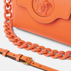 Crafted in Italy from premium leather, Versace’s latest handbag is adorned with a Medusa plaque – the same décor that was discovered on the doors of the brand’s first headquarters in Milan. The slouchy silhouette can be styled on the wrist or across the shoulder, featuring two detachable shoulderstraps: one leather and one chain.