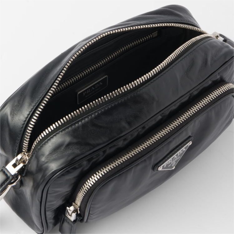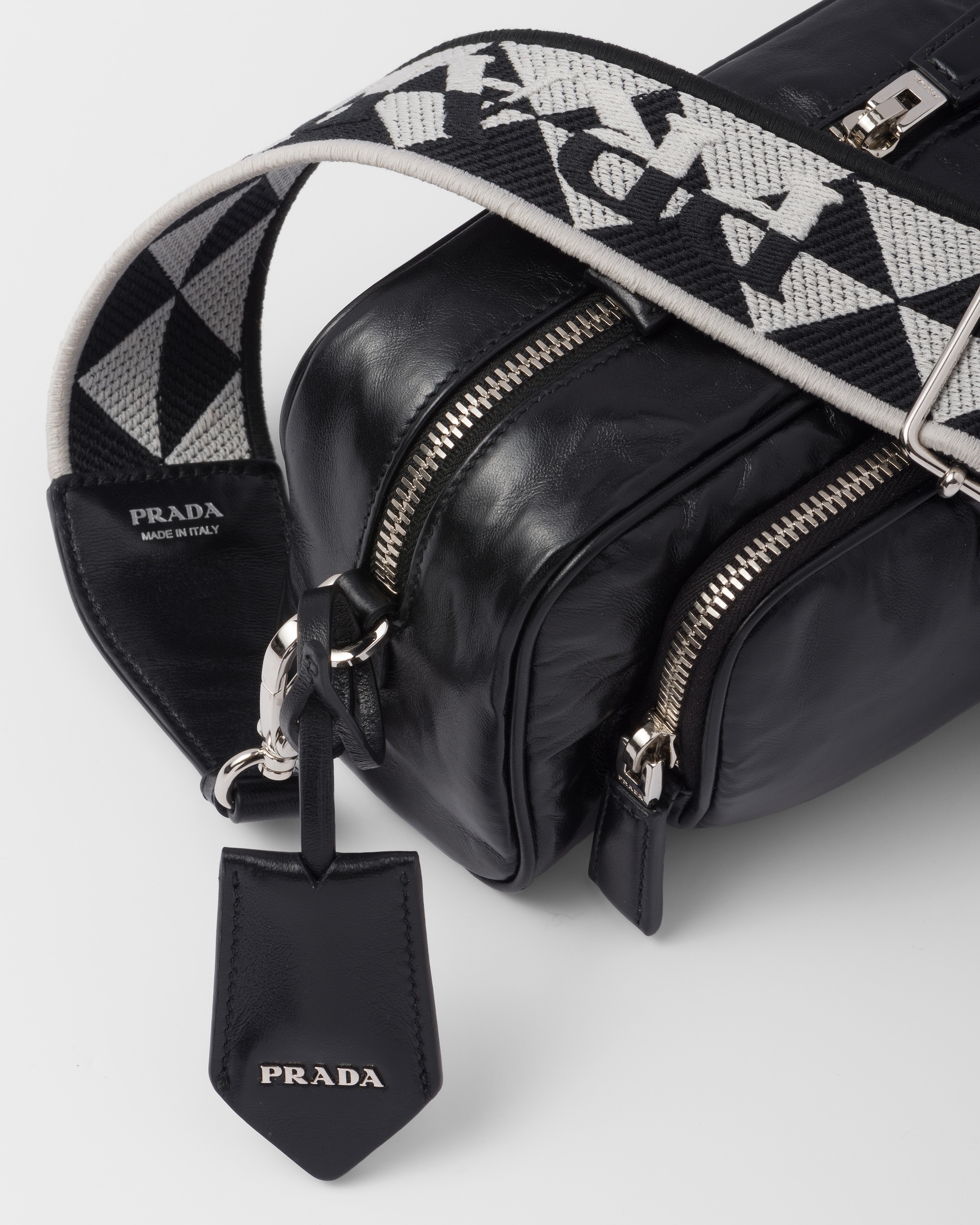 This bag with compact allure is made of nappa leather with a natural, glossy finish. The hand-made wrinkled effect contrasts with the constructed and rigid concept, reinterpreting an everyday object to be worn without constraints. Presented in the Spring Summer 2023 show, the style is accented with a finely embroidered shoulder strap with a sporty mood.
