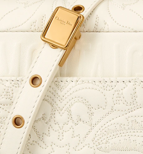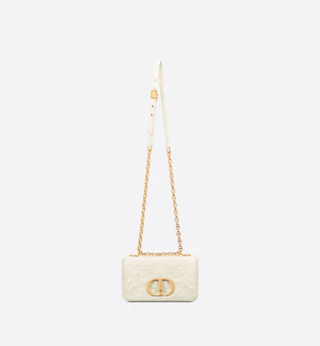 The Dior Caro bag combines modernity with timeless elegance. The design is crafted in latte quilted lambskin revealing the Ornamental motif, inspired by Andalusian baroque in a graphic spirit. The bag features a flap adorned with an antique gold-finish metal ‘CD’ twist clasp, inspired by the seal of a Christian Dior perfume bottle. The detachable chain shoulder strap with ‘CD’ signature links allows it to be carried by hand, over the shoulder or crossbody, or replaced by one of the House’s wide embroidered straps, allowing the small bag to pair with day or evening attire.
