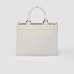 This elegant, minimalist leather handbag has two handles and a leather keychain inside. Steeped in a contemporary allure, this accessory features a motif that evokes the brand’s iconic geometric shape. Signature metal logo lettering stands out on the front.