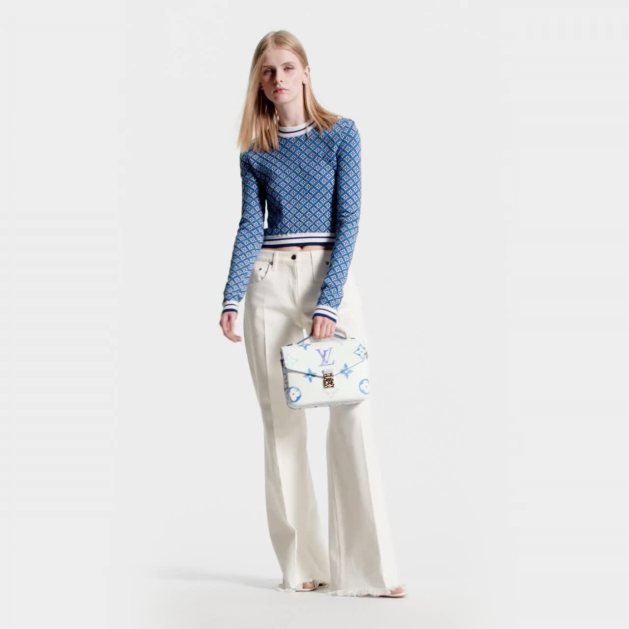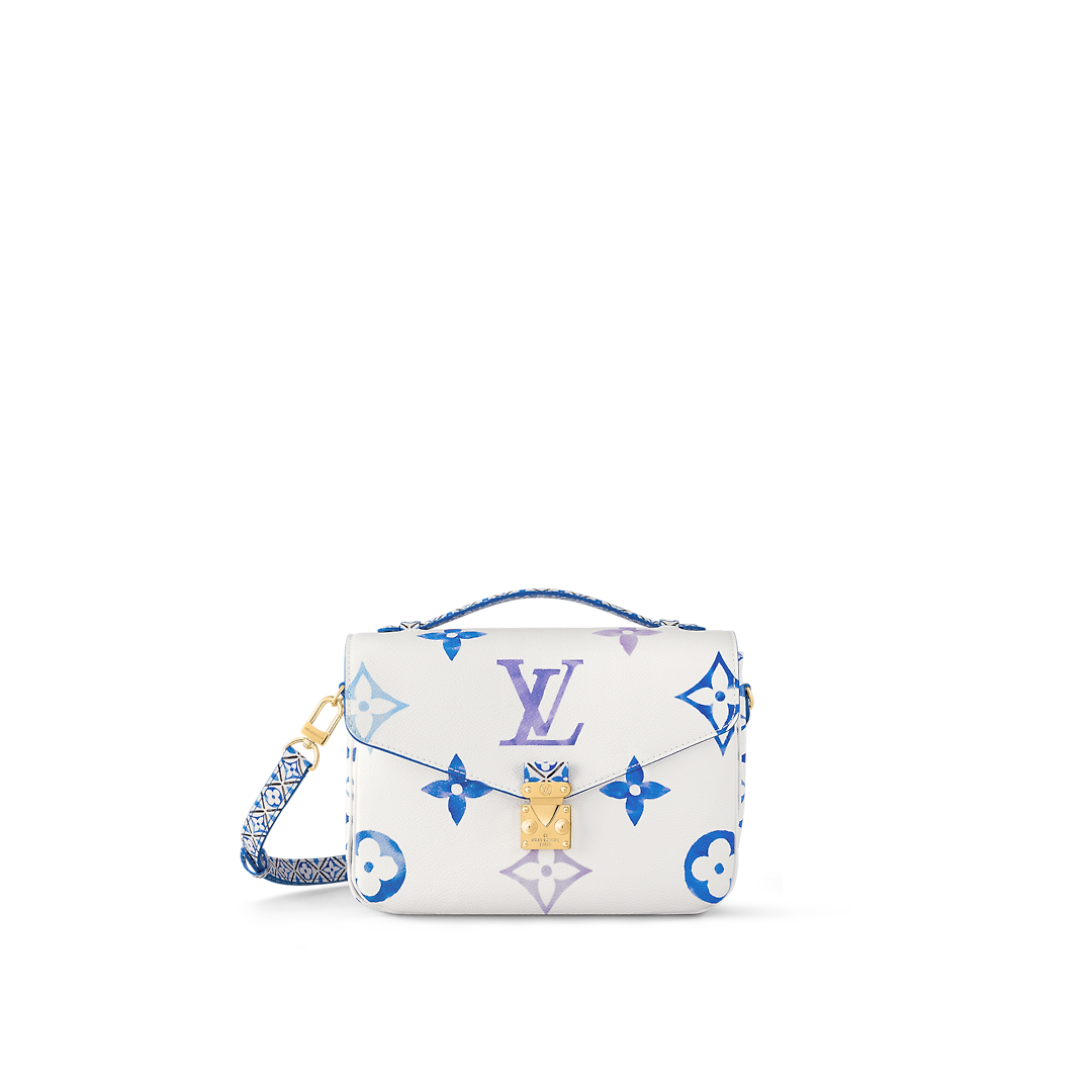 The Pochette Metis handbag is made from cream-color canvas with pastel LV’s and Monogram Flowers printed with a delicate watercolor effect. The top handle and removable strap feature a denser pattern of the Monogram Flowers, reminiscent of the painted ceramic tilework found in Lisbon.