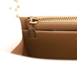 The interior is lined in gold leather and features a zipper pocket with Chanel pull and an open pocket below.