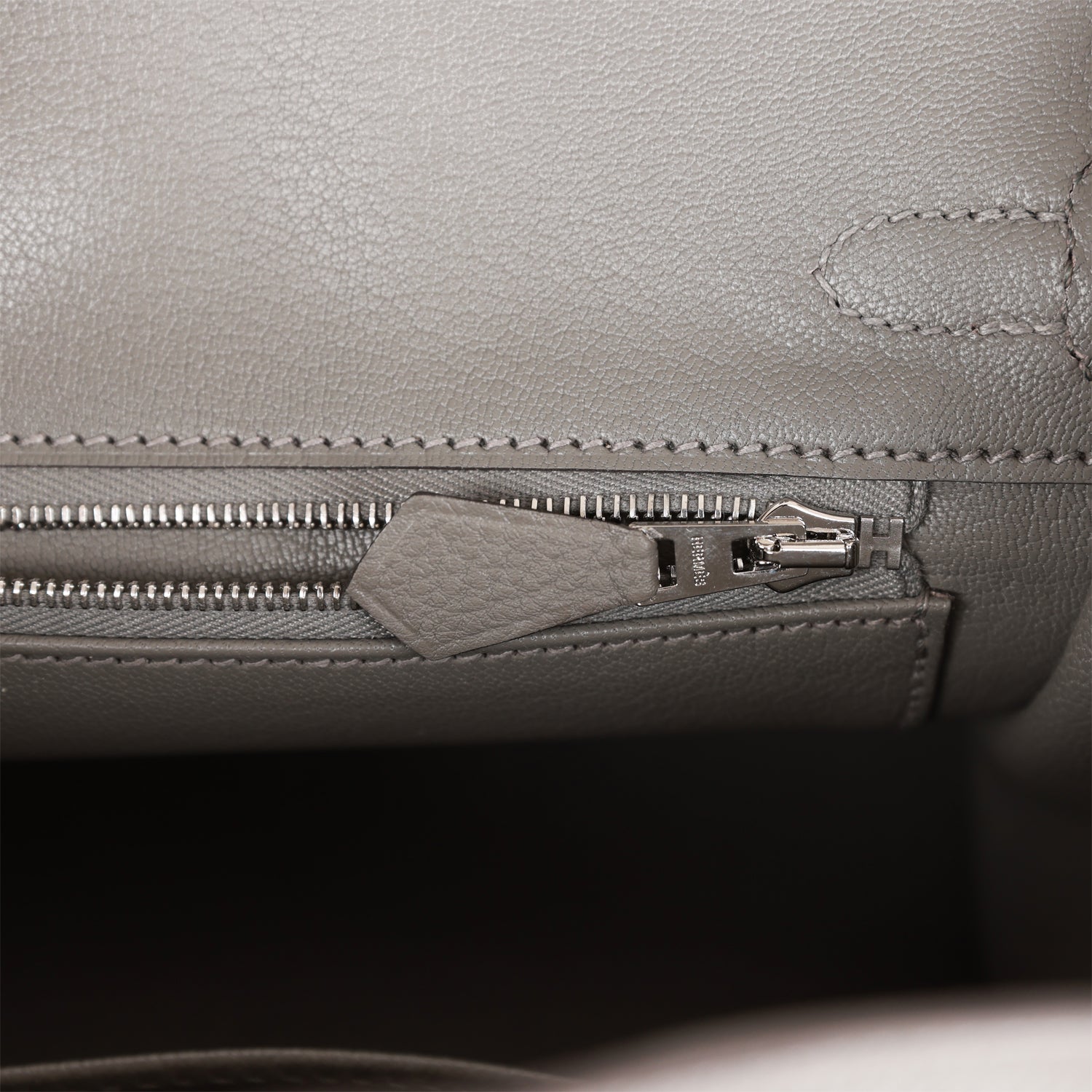 The interior is lined with Gris Meyer chevre and has a zip pocket with an Hermes engraved zipper pull and an open pocket on the opposite side.