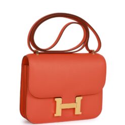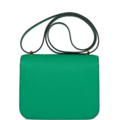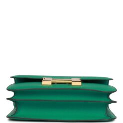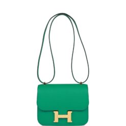 This Constance is in Vert Jade epsom leather with gold hardware and has tonal stitching, a metal “H” snap lock closure and adjustable shoulder strap.