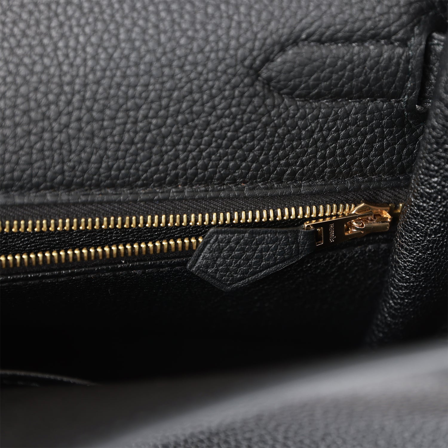 The interior is lined with black chevre and features one zip pocket with an Hermes engraved pull and two open pockets on the opposite side.