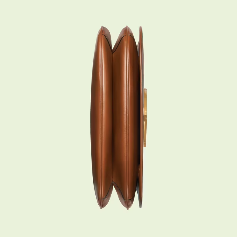 Coming from the House’s archives, a geometrically shaped version of the Interlocking G logo is reintroduced for Gucci Love Parade. The emblem enriches the design with a timeless feel—mirroring the Hollywood glamour that shaped the fashion show. This medium-sized version of the accessory is presented in brown leather.