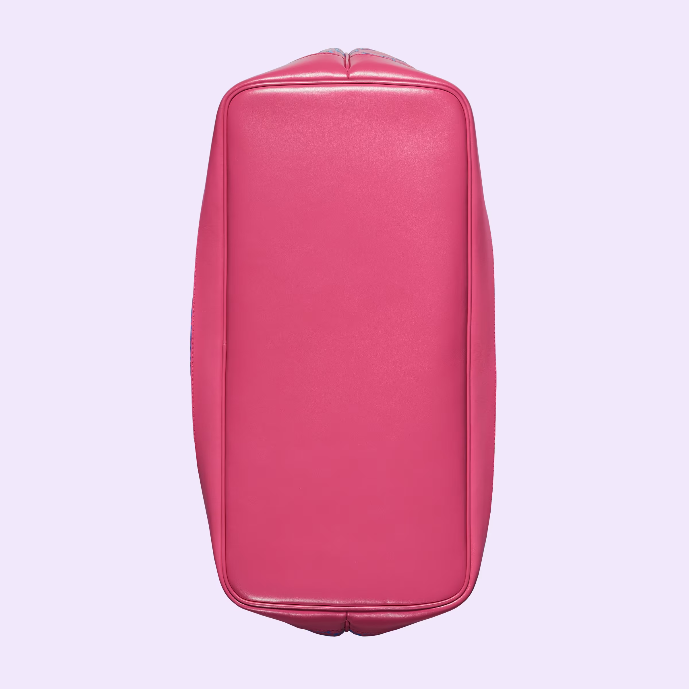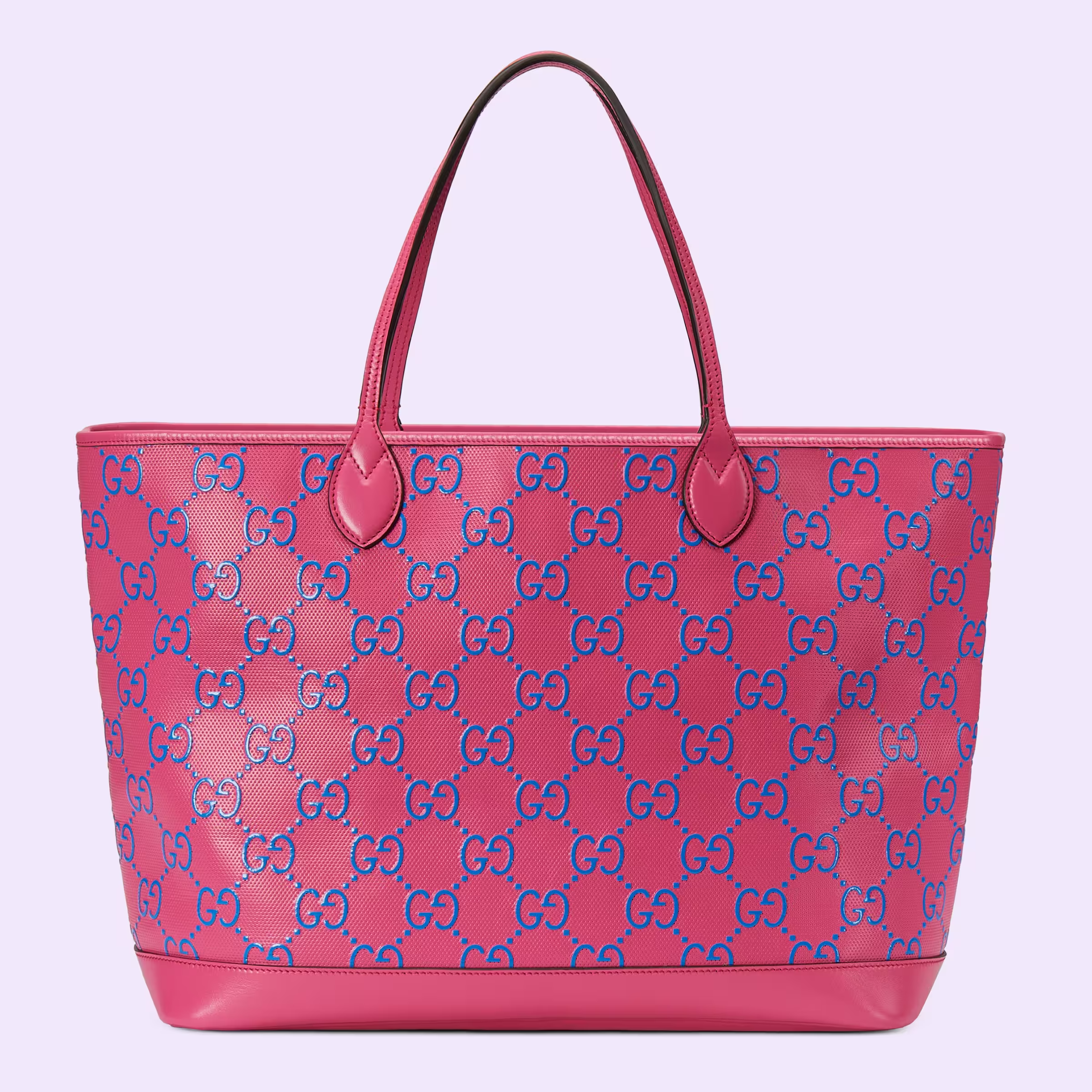The initials of Founder Guccio Gucci continue to decorate luggage accessories, connecting contemporary travel pieces to Gucci’s roots as a luggage porter. Here the emblematic GG motif appears in a playful two-toned embossed leather atop this tote bag. Noted for its softness and slightly shiny finish, the GG leather plays on texture, embossing the House emblem in blue onto a fuchsia base.