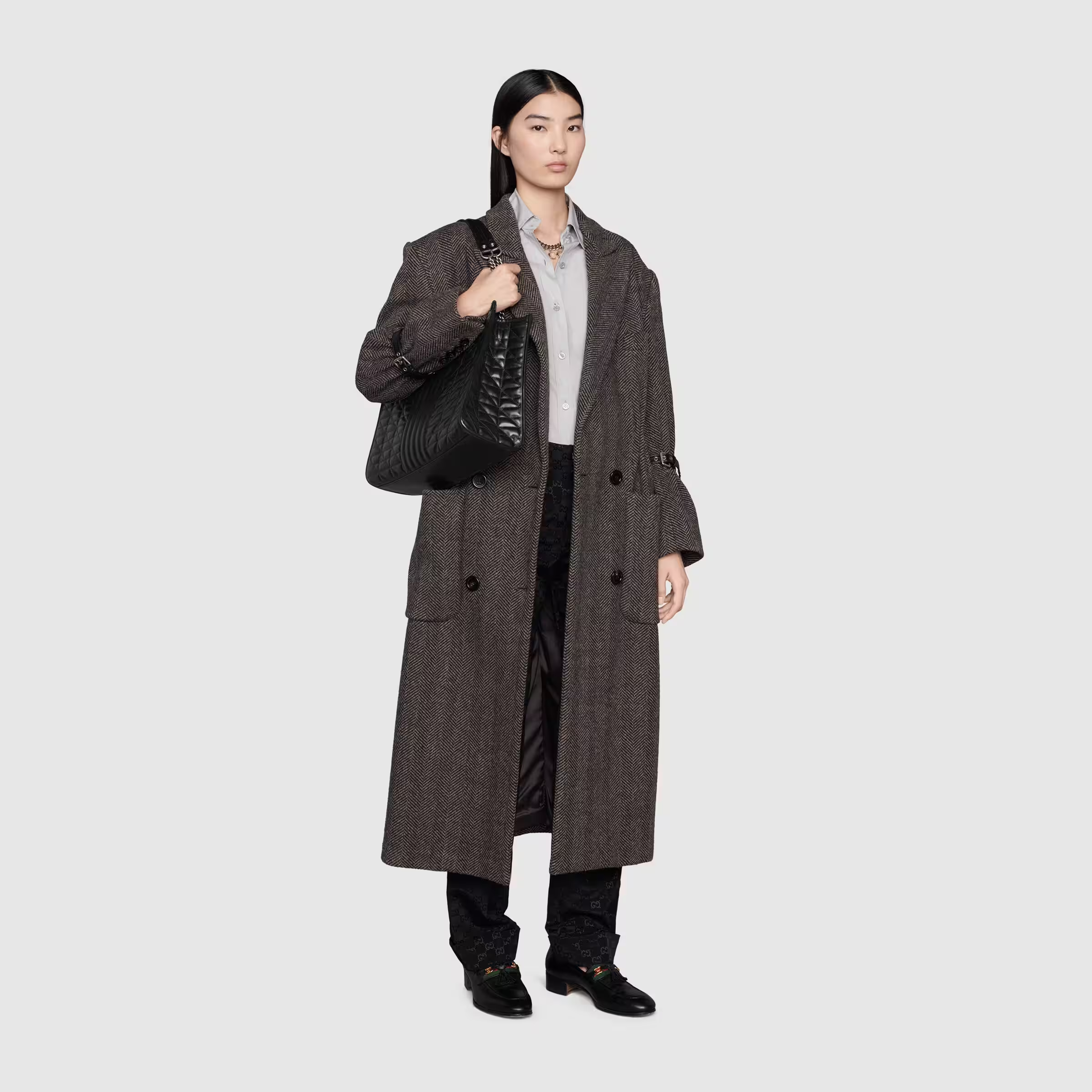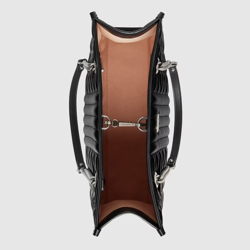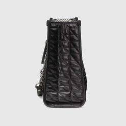 Gucci Aria explores the House’s archives, telling Gucci’s story though a mix of archival and contemporary elements. The GG Marmont was introduced in one of the Creative Director’s first fashion shows and each season its design evolves through the lens of the latest collection. Here, the tote bag is presented in black matelassé leather with antique silver-toned hardware.