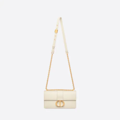 The East-West bag with chain enhances the 30 Montaigne line with a timeless and elegant design crafted in latte calfskin. The flap has an antique gold-finish metal CD clasp, inspired by the seal of a Christian Dior perfume bottle. Other details, like the embossed 30 Montaigne signature on the back, highlight the streamlined design. The bag features a removable chain strap with a leather insert that allows it to be comfortably carried by hand, worn over the shoulder or crossbody.