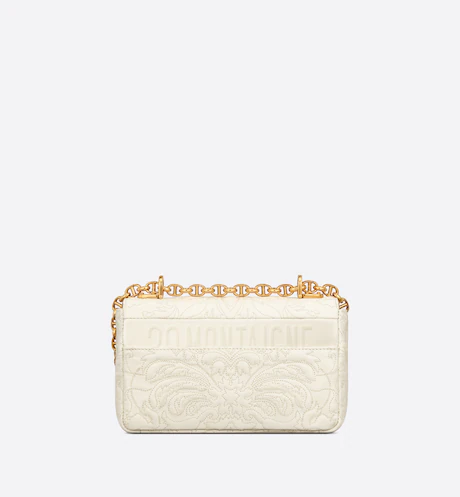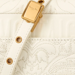 The Dior Caro bag combines modernity with timeless elegance. The design is crafted in latte quilted lambskin revealing the Ornamental motif, inspired by Andalusian baroque in a graphic spirit. The bag features a flap adorned with an antique gold-finish metal ‘CD’ twist clasp, inspired by the seal of a Christian Dior perfume bottle. The detachable chain shoulder strap with ‘CD’ signature links allows it to be carried by hand, over the shoulder or crossbody, or replaced by one of the House’s wide embroidered straps, allowing the small bag to pair with day or evening attire.