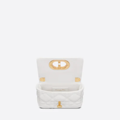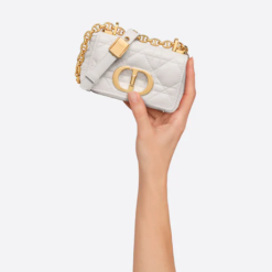 The Dior Caro bag is a creation that combines modernity and timeless elegance. Crafted in latte supple calfskin with Cannage stitching, it features a flap adorned with a ‘CD’ clasp, inspired by the seal of a Christian Dior perfume bottle. The miniature shape’s chain shoulder strap has a leather insert that provides a comfortable and adjustable carry, to be worn with day or evening attire.
