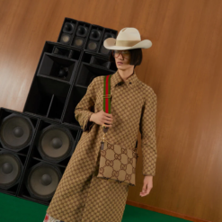 First seen as part of Gucci Aria, the jumbo version of the emblematic GG motif returns atop signature luggage pieces, imbuing each design with a pronounced logo feel. This messenger bag is accentuated by the signature green and red House Web, a contemporary take on a Gucci archival belt buckle from the ’70s.