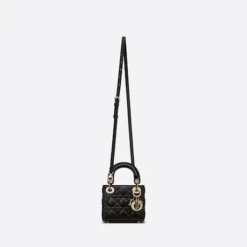 The Lady Dior bag embodies the House’s vision of elegance and beauty. Crafted in black lambskin with signature Cannage topstitching, its iconic silhouette is embellished with a ‘D.I.O.R.’ charm. The micro style can accommodate all the daily essentials and features an adjustable and removable shoulder strap, allowing it to be carried by hand, worn over the shoulder or crossbody.