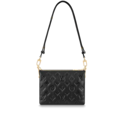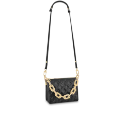 The Coussin BB has the softest cushion-like texture. The Coussin BB is made of puffed lamb leather embossed with a Monogram pattern in a lovely compact size. The chunky gold-colored chain and slender leather strap are both detachable