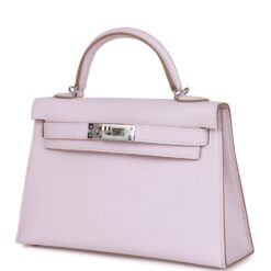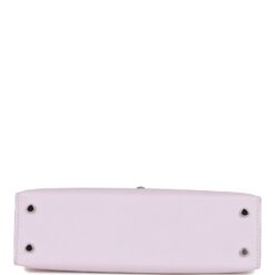 This Kelly, in the Sellier style, is in Mauve Pale epsom leather with palladium hardware and has tonal stitching, front flap, two straps with center toggle closure, single rolled handle and removable shoulder strap.