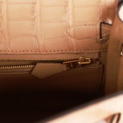 This Retourne Kelly is in Chai matte Mississippiensis alligator with gold hardware and has tonal stitching, front flap, two straps with center toggle closure, clochette with lock and two keys, single rolled handle and removable strap.